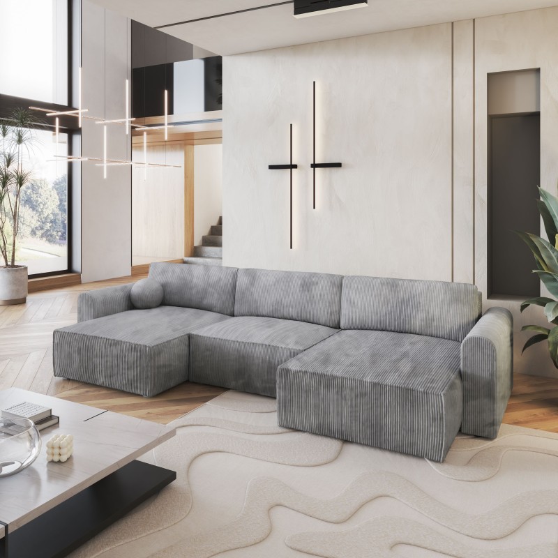 Narożnik FENTO to idealne rozwiązanie dla miłośników nowoczesnego stylu i niebanalnych materiałów. Prążkowana faktura sztruksu, zaokrąglone boczki oraz wygodne i praktyczne rozwiązania sprawiają, że jest to model, który przyciąga wzrok i oferuje wyjątkowy komfort użytkowania.