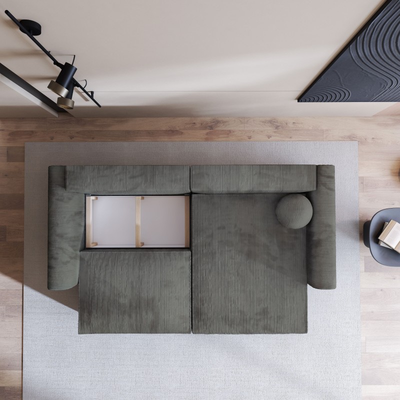 Pod siedziskiem znajduje się przestronny schowek, który pozwala przechować koce, poduszki czy inne niezbędne akcesoria. To praktyczne rozwiązanie pomaga utrzymać porządek w salonie bez zajmowania dodatkowej przestrzeni.