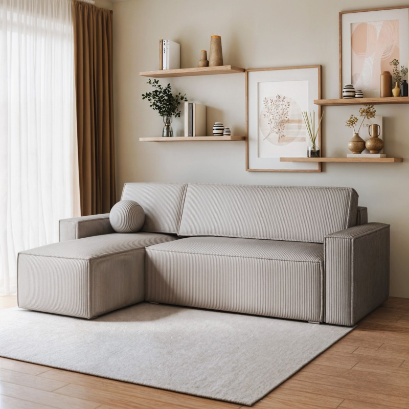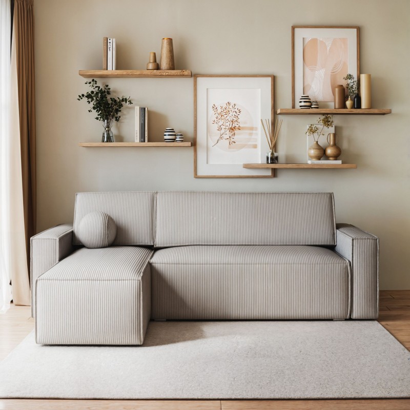 - Funkcja spania – komfort na co dzień – RAVELO posiada wbudowany mechanizm pozwalający na łatwe rozłożenie narożnika, zamieniając go w wygodne łóżko. To świetna opcja dla osób szukających komfortowego miejsca do spania dla gości lub codziennego wypoczynku.