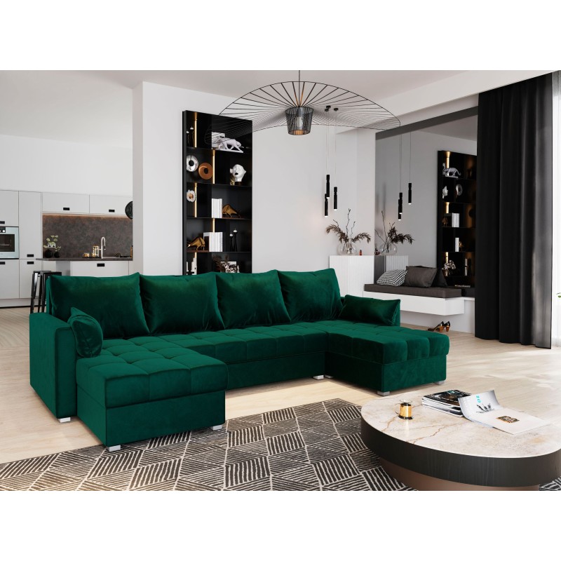 Masseno Narożnik NAKO z funkcją spania i pojemnikiem na pościel Narozniki U, Rozkładana sofa - Butelkowa zieleń, KRONOS 19