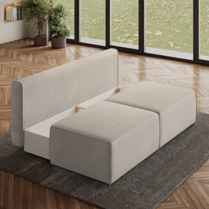Modułowa konstrukcja – elastyczność w aranżacji – Dzięki możliwości przestawiania pufy raz z lewej, raz z prawej strony, narożnik można dopasować do każdej przestrzeni. To idealne rozwiązanie dla osób, które lubią zmiany i elastyczność w aranżacji wnętrza.