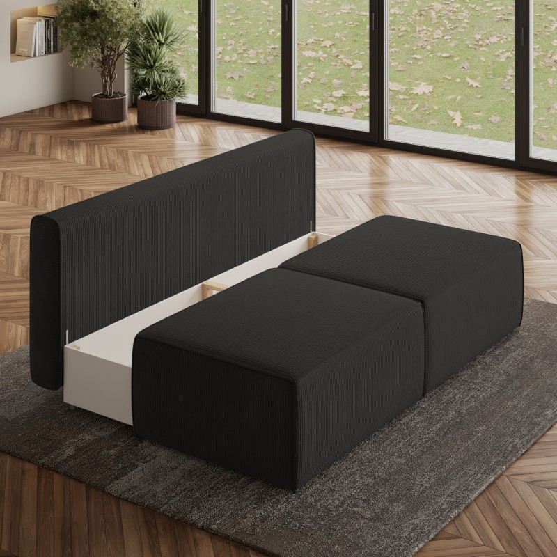 Wbudowany pojemnik na pościel – praktyczne przechowywanie – Ukryty w podstawie narożnika pojemnik pozwala na schowanie pościeli, poduszek czy koców, pomagając utrzymać porządek w pomieszczeniu. Dzięki temu zyskujesz więcej miejsca i funkcjonalności.