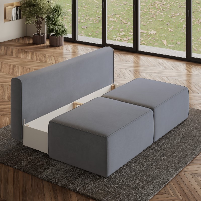 Wbudowany pojemnik na pościel – praktyczne przechowywanie – Ukryty w podstawie narożnika pojemnik pozwala na schowanie pościeli, poduszek czy koców, pomagając utrzymać porządek w pomieszczeniu. Dzięki temu zyskujesz więcej miejsca i funkcjonalności.