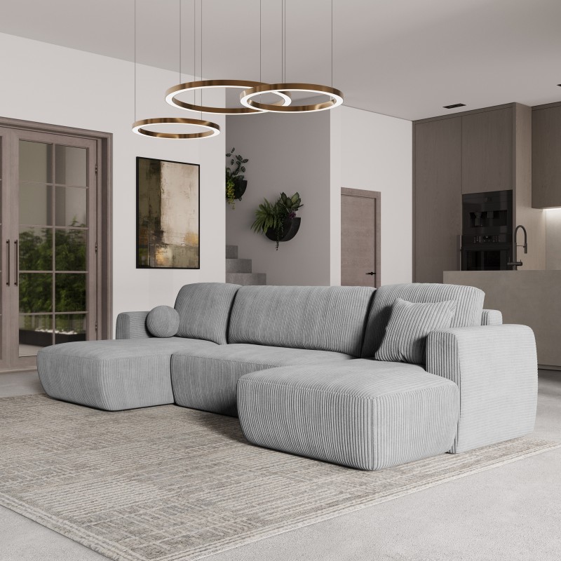 Nowoczesny design i zaokrąglone kształty – Miękkie, opływowe linie sprawiają, że narożnik prezentuje się nowocześnie i stylowo. Jego minimalistyczna, ale efektowna forma doskonale wpisuje się w aktualne trendy wnętrzarskie.