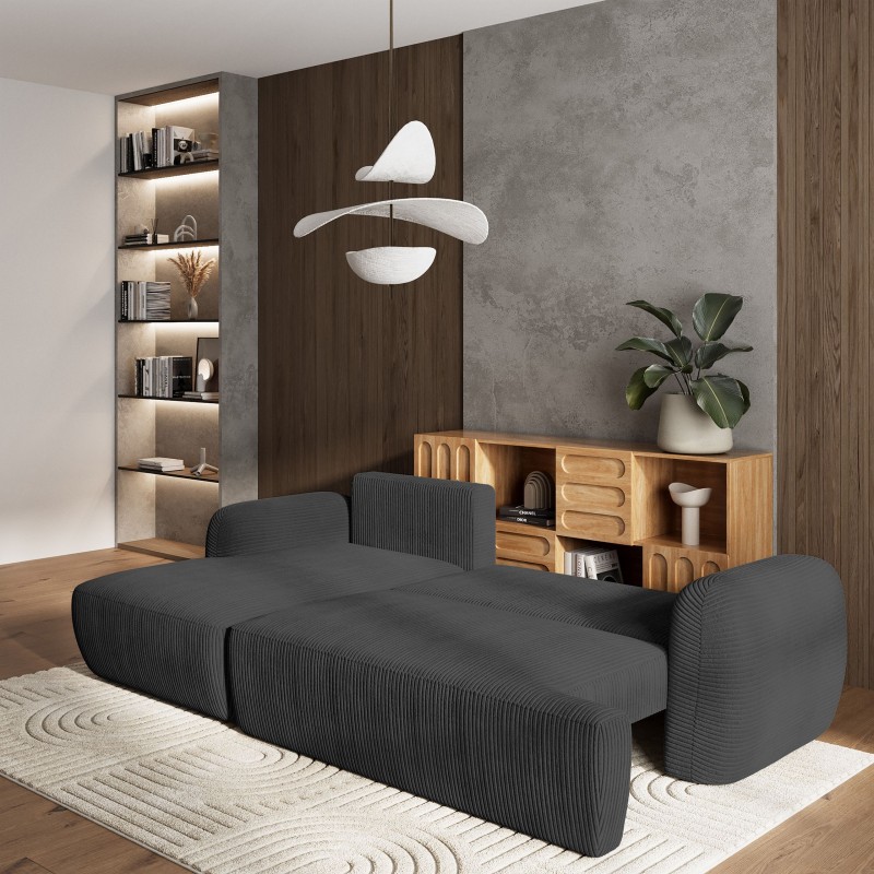 MODENZA w tkaninie POSO to idealne rozwiązanie dla tych, którzy pragną połączyć modny, designerski wygląd z maksymalnym komfortem użytkowania. Dzięki sztruksowej tapicerce, opływowym kształtom i funkcji spania, stanie się centralnym punktem Twojego salonu, oferując wygodę na najwyższym poziomie.