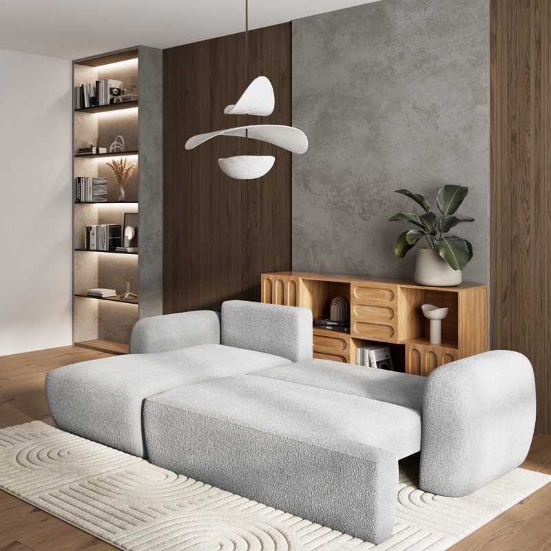 Tkanina NOW OR NEVER, w której wykonano narożnik, to innowacyjny materiał o niezwykle miękkiej strukturze. Charakteryzuje się wyjątkową odpornością na ścieranie oraz łatwością w czyszczeniu, dzięki czemu MODENZA przez długie lata zachowa swój nieskazitelny wygląd. To materiał, który łączy luksusowy wygląd z funkcjonalnością, zapewniając nie tylko estetykę, ale i komfort codziennego użytkowania. Stylowa tkanina typu boucle, posiada miliony delikatnych pętelek, dzięki czemu stwarza przytulną atmosferę. Narożnik został wyposażony w funkcję spania, dzięki której w kilka chwil można go przekształcić w wygodne łóżko. Dostępność w wersji lewo- i prawostronnej pozwala na dostosowanie układu narożnika do własnych potrzeb, a dla jeszcze większej wygody można domówić automat wspomagający rozkładanie.