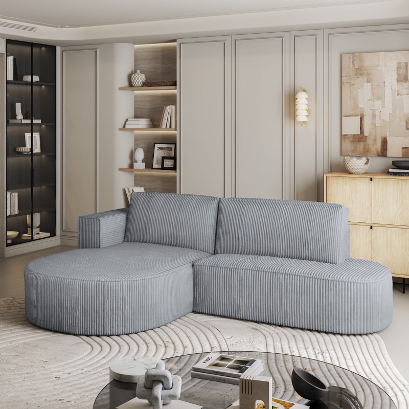- Zaokrąglona otomana – miękki akcent i unikalny design. Obły kształt otomany przełamuje klasyczną geometrię narożników, nadając całości eleganckiego i nowoczesnego wyrazu. To także idealne miejsce do relaksu w pozycji półleżącej.