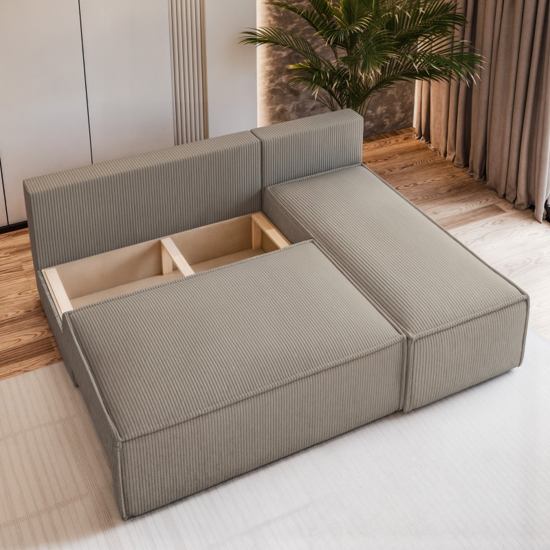 Wbudowany pojemnik, który znajduje się pod siedziskiem, zapewnia Ci dodatkowe miejsce do przechowywania. Nie musisz się już martwić co zrobić z pościelą dla gości, a dzięki temu, że zawsze będzie pod ręką, zachowasz porządek, nawet w przypadku korzystania z narożnika jako głównego mebla do spania.