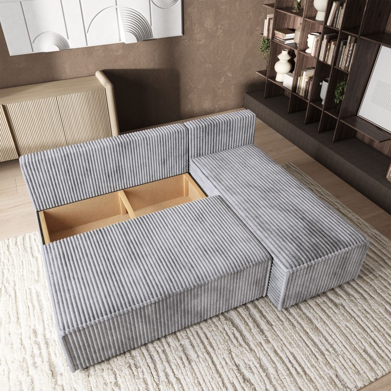 Wbudowany pojemnik, który znajduje się pod siedziskiem, zapewnia Ci dodatkowe miejsce do przechowywania. Nie musisz się już martwić co zrobić z pościelą dla gości, a dzięki temu, że zawsze będzie pod ręką, zachowasz porządek, nawet w przypadku korzystania z narożnika jako głównego mebla do spania.
