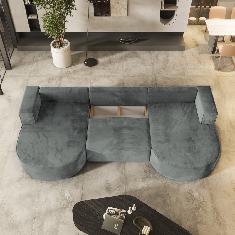 - Zaokrąglona otomana – miękki akcent i unikalny design. Obły kształt otomany przełamuje klasyczną geometrię narożników, nadając całości eleganckiego i nowoczesnego wyrazu. To także idealne miejsce do relaksu w pozycji półleżącej.
