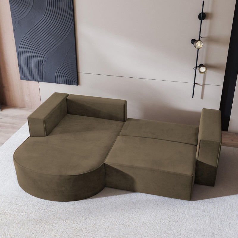 Narożnik SORELA przyciąga uwagę swoją oryginalną formą i wysokim komfortem użytkowania. Jego wyróżnikiem jest zaokrąglona część z szezlongiem, która dodaje całości nowoczesnego charakteru i lekkości wizualnej. Delikatna asymetria i wyważone proporcje sprawiają, że mebel idealnie odnajduje się w nowoczesnych aranżacjach, prezentując się niezwykle elegancko.