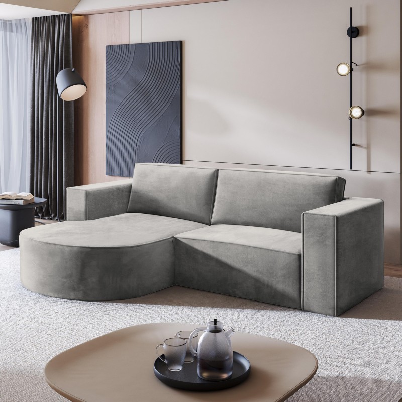 Narożnik SORELA przyciąga uwagę swoją oryginalną formą i wysokim komfortem użytkowania. Jego wyróżnikiem jest zaokrąglona część z szezlongiem, która dodaje całości nowoczesnego charakteru i lekkości wizualnej. Delikatna asymetria i wyważone proporcje sprawiają, że mebel idealnie odnajduje się w nowoczesnych aranżacjach, prezentując się niezwykle elegancko.