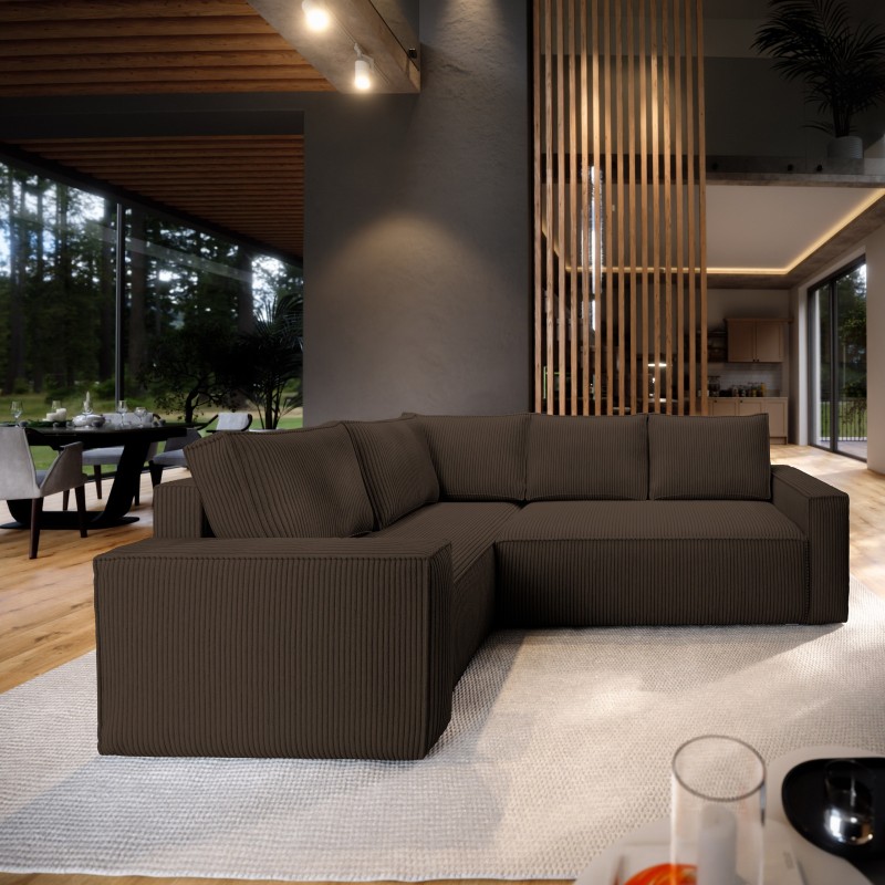 Model został zaprojektowany w praktycznym kształcie litery L, co pozwala maksymalnie wykorzystać przestrzeń, zarówno w mniejszych, jak i większych pomieszczeniach. Dodatkowym atutem jest możliwość wyboru strony – lewostronnej lub prawostronnej – dzięki czemu dopasujesz narożnik idealnie do układu Twojego salonu.