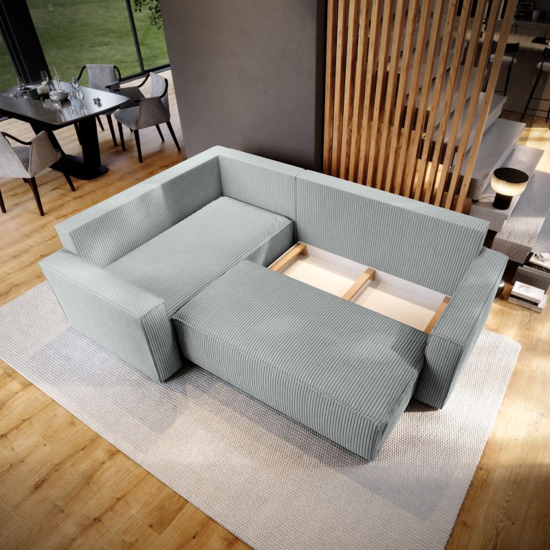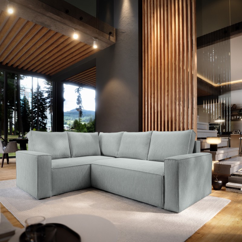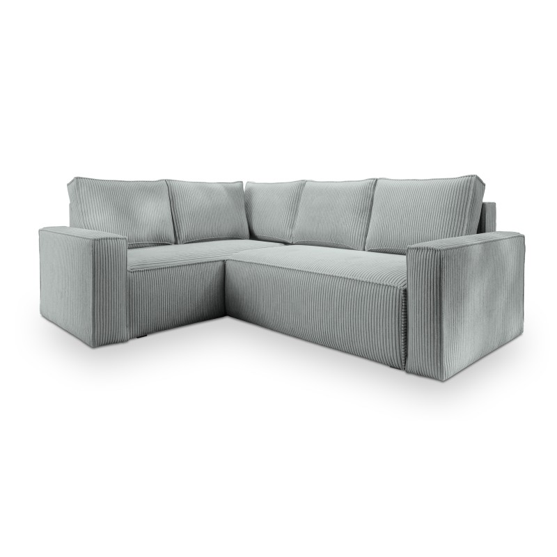 Model został zaprojektowany w praktycznym kształcie litery L, co pozwala maksymalnie wykorzystać przestrzeń, zarówno w mniejszych, jak i większych pomieszczeniach. Dodatkowym atutem jest możliwość wyboru strony – lewostronnej lub prawostronnej – dzięki czemu dopasujesz narożnik idealnie do układu Twojego salonu.