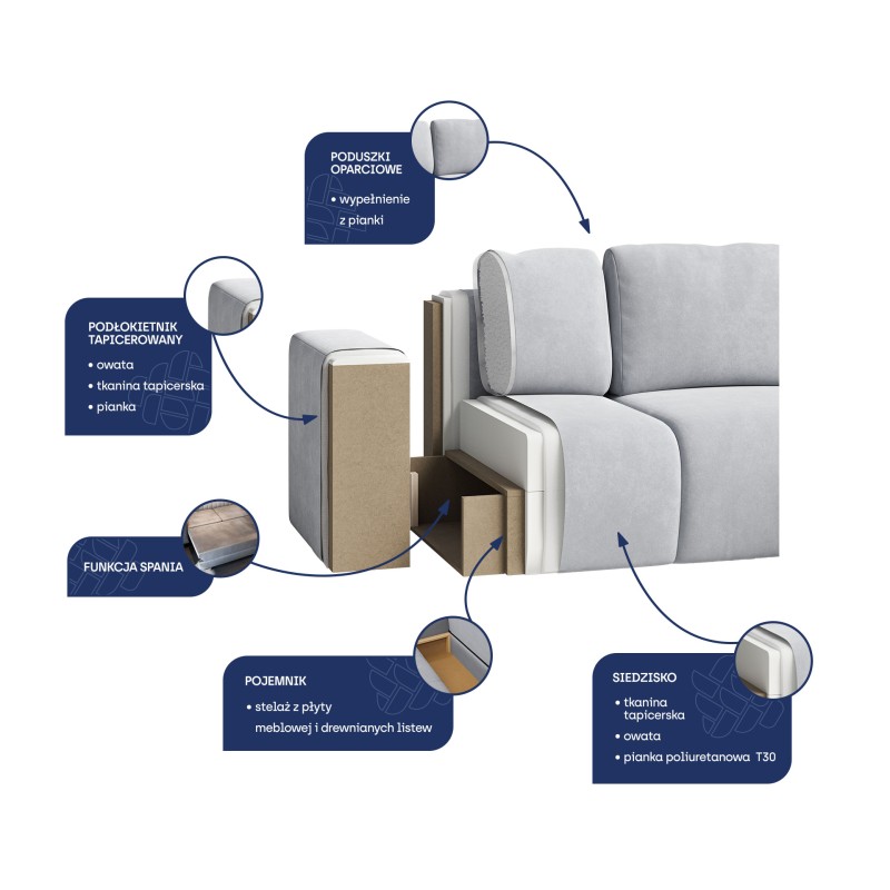 - Narożnik posiada funkcję spania, co przekłada się na jego jeszcze większą uniwersalność i funkcjonalność. Nie daj się zaskoczyć niezapowiedzianym gościom.