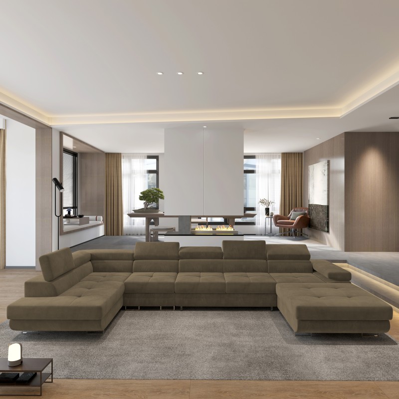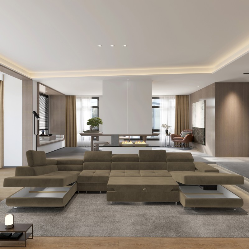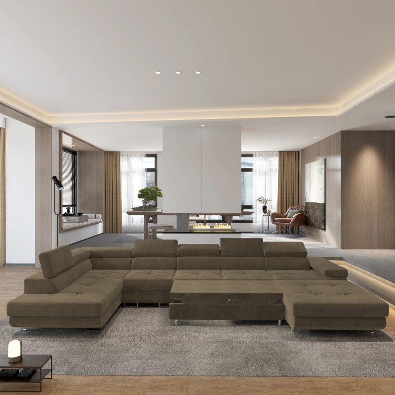 Obity wysokogatunkową, welurową tkaniną - niezwykle miłą i aksamitną w dotyku, zachwyca miękkością i jednocześnie wytrzymałością na codzienne użytkowanie. Jego starannie wykonane detale podkreślają elegancję mebla i doskonale współgrają zarówno z minimalistycznym wystrojem wnętrz, jak i bardziej wyszukanymi aranżacjami. VELORA to duży narożnik u-kształtny o wyjątkowej funkcjonalności – dzięki przestronnej budowie z łatwością pomieści wszystkich Twoich gości, zapewniając każdemu komfortową przestrzeń do odpoczynku. Przemyślane połączenie formy z funkcją pozwala Ci zarówno na relaks przed telewizorem, jak i na wygodne spędzanie czasu z najbliższymi. W otomanach ukryte są dwa pojemniki o sporej kubaturze, co pozwoli Ci na przechowywanie zapasowych pościeli, koców, czy nawet świątecznych ozdób, które nie mają swojego miejsca.