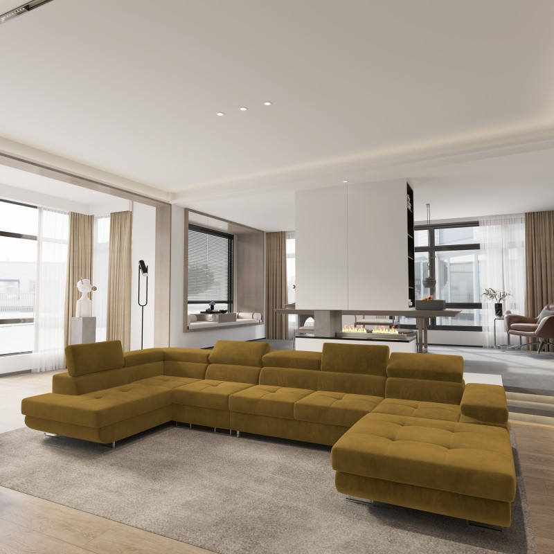 Obity wysokogatunkową, welurową tkaniną - niezwykle miłą i aksamitną w dotyku, zachwyca miękkością i jednocześnie wytrzymałością na codzienne użytkowanie. Jego starannie wykonane detale podkreślają elegancję mebla i doskonale współgrają zarówno z minimalistycznym wystrojem wnętrz, jak i bardziej wyszukanymi aranżacjami. VELORA to duży narożnik u-kształtny o wyjątkowej funkcjonalności – dzięki przestronnej budowie z łatwością pomieści wszystkich Twoich gości, zapewniając każdemu komfortową przestrzeń do odpoczynku. Przemyślane połączenie formy z funkcją pozwala Ci zarówno na relaks przed telewizorem, jak i na wygodne spędzanie czasu z najbliższymi. W otomanach ukryte są dwa pojemniki o sporej kubaturze, co pozwoli Ci na przechowywanie zapasowych pościeli, koców, czy nawet świątecznych ozdób, które nie mają swojego miejsca.