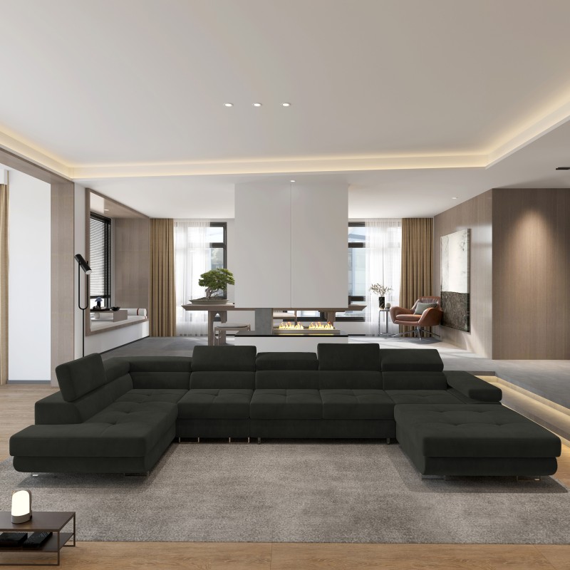 Obity wysokogatunkową, welurową tkaniną - niezwykle miłą i aksamitną w dotyku, zachwyca miękkością i jednocześnie wytrzymałością na codzienne użytkowanie. Jego starannie wykonane detale podkreślają elegancję mebla i doskonale współgrają zarówno z minimalistycznym wystrojem wnętrz, jak i bardziej wyszukanymi aranżacjami. VELORA to duży narożnik u-kształtny o wyjątkowej funkcjonalności – dzięki przestronnej budowie z łatwością pomieści wszystkich Twoich gości, zapewniając każdemu komfortową przestrzeń do odpoczynku. Przemyślane połączenie formy z funkcją pozwala Ci zarówno na relaks przed telewizorem, jak i na wygodne spędzanie czasu z najbliższymi. W otomanach ukryte są dwa pojemniki o sporej kubaturze, co pozwoli Ci na przechowywanie zapasowych pościeli, koców, czy nawet świątecznych ozdób, które nie mają swojego miejsca.