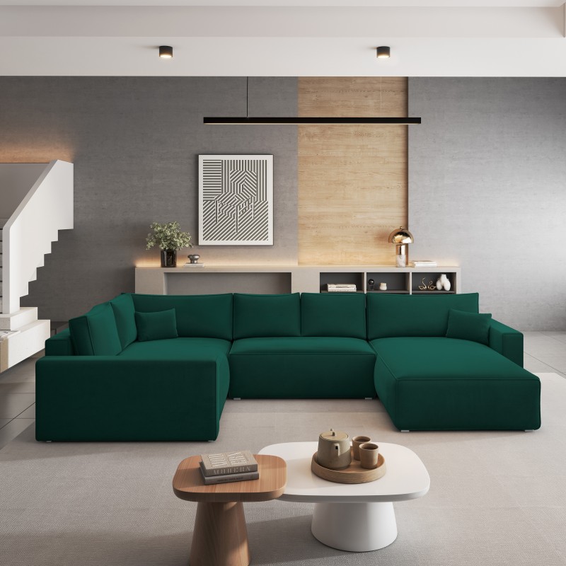 Odkryj narożnik VELAMI – luksusowy, komfortowy i wyjątkowo praktyczny mebel. Duży u-kształtny narożnik, pozwoli wygodnie spędzać czas z najbliższymi. Wyobraź sobie niedzielne popołudnie, gdy cała rodziną możecie oddać się filmowym seansom lub wygodnie spędzić czas przy ulubionych planszówkach.