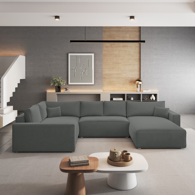 Odkryj narożnik VELAMI – luksusowy, komfortowy i wyjątkowo praktyczny mebel. Duży u-kształtny narożnik, pozwoli wygodnie spędzać czas z najbliższymi. Wyobraź sobie niedzielne popołudnie, gdy cała rodziną możecie oddać się filmowym seansom lub wygodnie spędzić czas przy ulubionych planszówkach.
