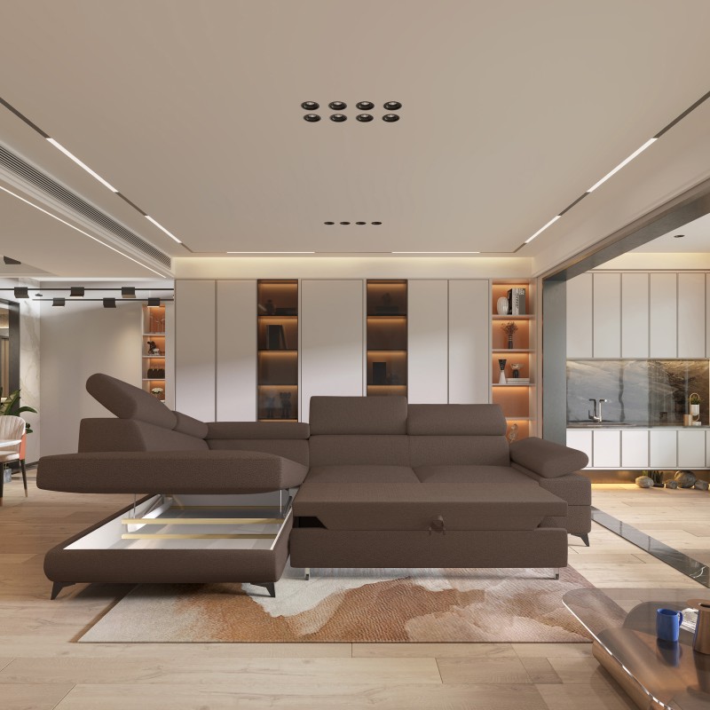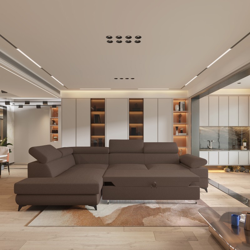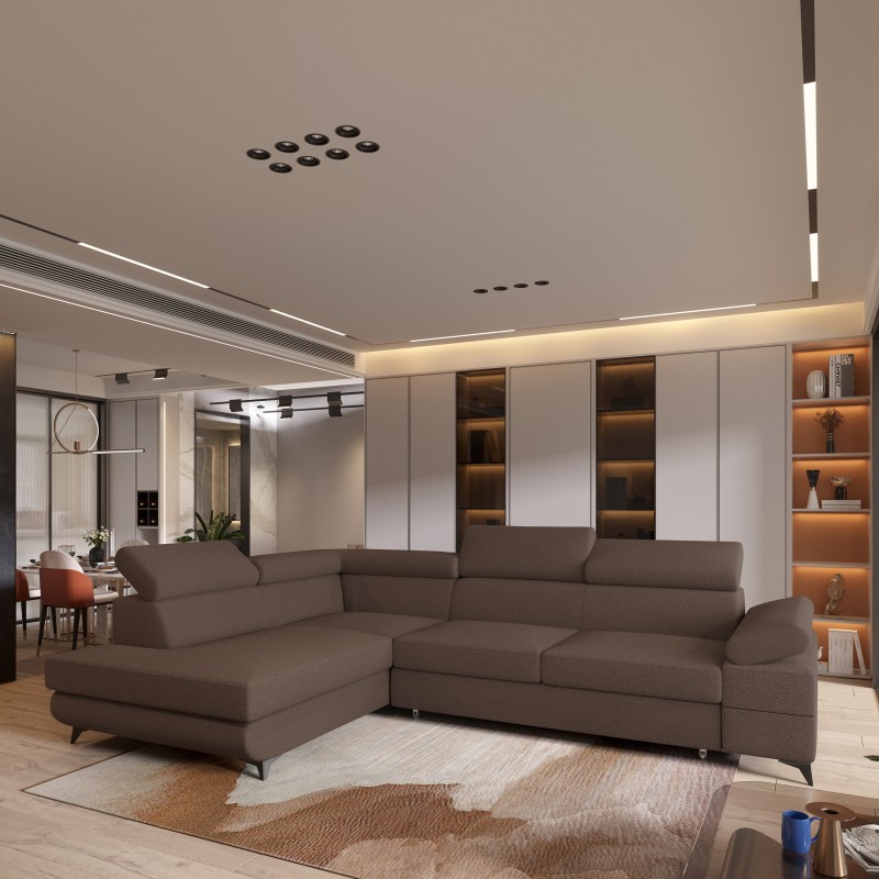 Dzięki funkcji spania rozłożysz go w kilka chwil i zyskasz wygodne łóżko dla niezapowiedzianych gości. Pojemny schowek ukryty w otomanie to praktyczna przestrzeń na pościel, pledy czy rzadziej używane poduszki. Regulowane zagłówki i podłokietnik dają Ci pełną kontrolę nad tym, jak odpoczywasz – czy siedzisz prosto podczas porannej kawy, czy leżysz wygodnie z książką w ręce. A to wszystko na sprężynach falistych, które dbają o Twoje plecy nawet po długim dniu. Tkanina Quelle zachwyca subtelną strukturą, a przy tym jest przyjemna w dotyku i odporna na codzienne użytkowanie – idealna do domów, w których dzieje się życie. FAVIEN stoi na czarnych metalowych nogach, które dodają mu lekkości, ale też praktycznego wymiaru – łatwo utrzymasz czystość pod meblem, nawet bez odkurzacza ręcznego. Wersja lewo- lub prawostronna pozwoli Ci zaaranżować wnętrze dokładnie tak, jak chcesz.