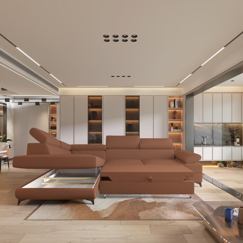 Masseno Narożnik FAVIEN z funkcją spania i pojemnikiem na pościel Narozniki L, Rozkładana sofa - Miedziany, QUELLE 54