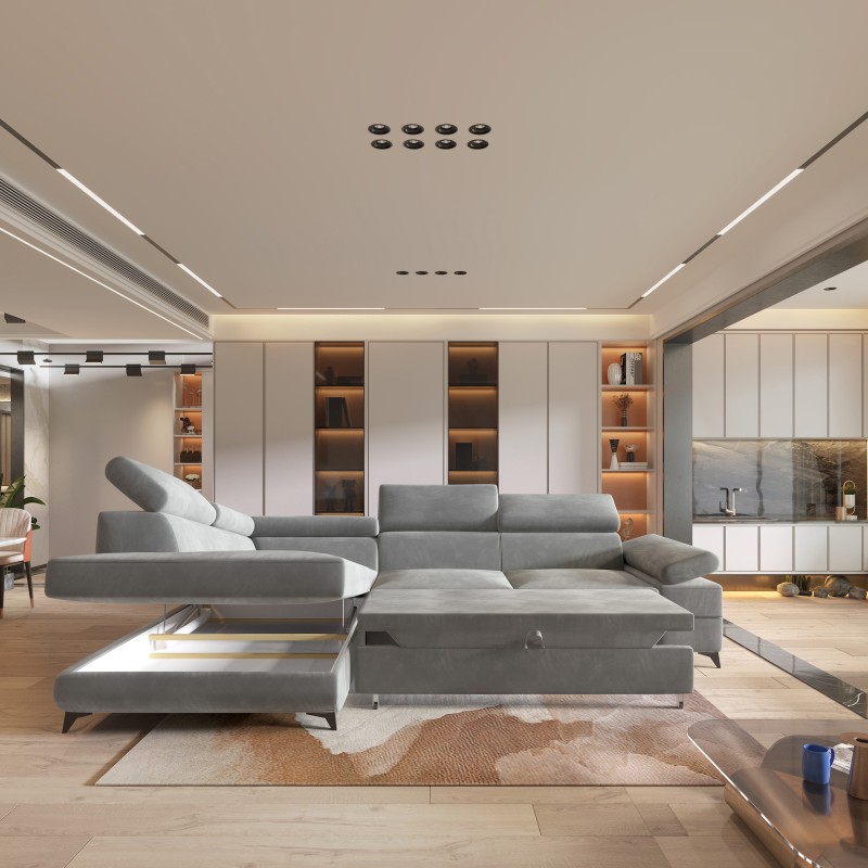 Masseno Narożnik FAVIEN z funkcją spania i pojemnikiem na pościel Narozniki L, Rozkładana sofa - Jasnoszary, MONOLITH 84