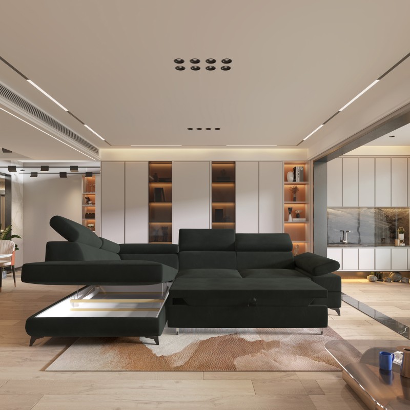 To mebel stworzony z myślą o komforcie całej rodziny: rozkładana funkcja spania sprawdzi się zarówno przy niespodziewanych gościach, jak i podczas leniwego weekendu z ulubionymi filmami. Pojemnik na pościel w otomanie pomieści cały komplet kołder i poduszek, a regulowane zagłówki i podłokietnik pozwolą Ci idealnie dopasować kąt relaksu - niezależnie, czy czytasz książkę, pracujesz z laptopem czy ucinasz sobie drzemkę. FAVIEN to narożnik, który „unosi się” na wysokich, czarnych metalowych nóżkach – świetnie wygląda i równie świetnie działa: pod niego bez problemu wjedzie większość robotów sprzątających. Dzięki temu Twój salon pozostaje czysty bez dodatkowego wysiłku. Tkanina Monolith to nie tylko aksamitny połysk i szlachetna głębia koloru – to także wysoka odporność na ścieranie i powłoka hydrofobowa, która ułatwia usuwanie plam z kawy, herbaty czy soku.