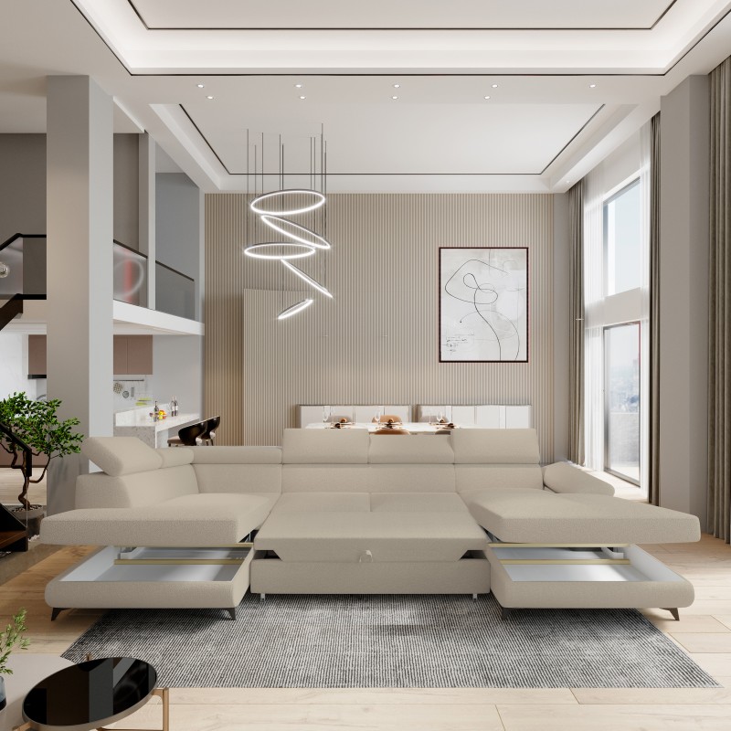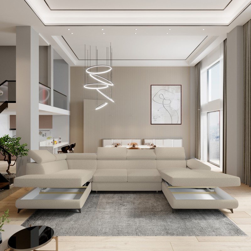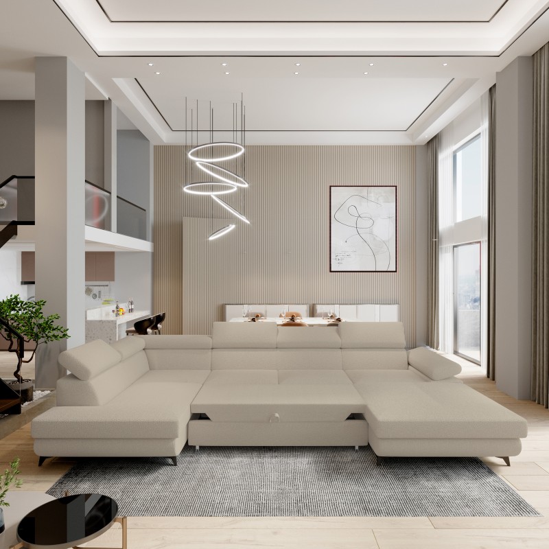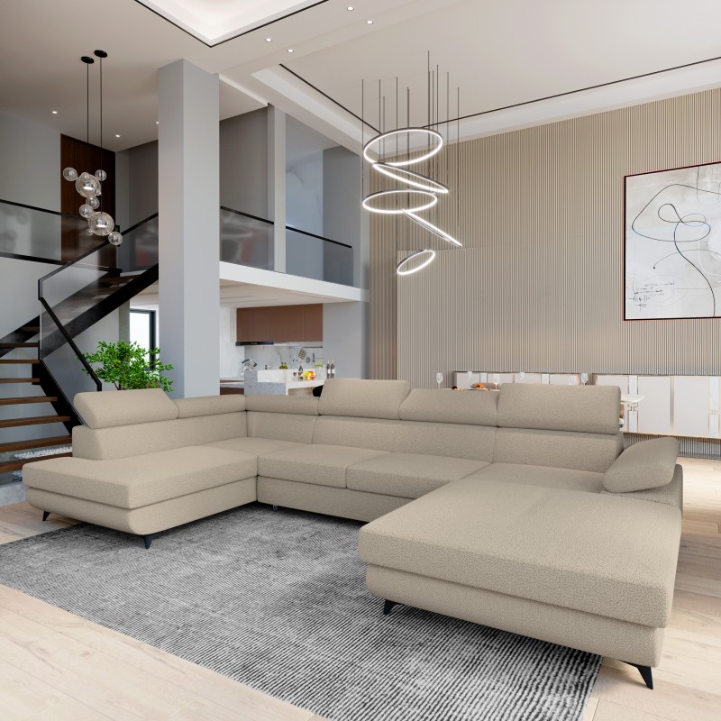 Funkcja spania wbudowana w narożnik pozwala szybko zmienić salon w komfortową przestrzeń noclegową - bez kompromisów, bez wysiłku. Dwa pojemniki na pościel to ukryty atut, który ułatwia życie: pozwalają uporządkować przestrzeń, jednocześnie pozostając całkowicie niewidoczne. Niezależnie od tego, czy urządzasz nowoczesny salon w apartamencie, czy szukasz stylowego mebla do przestronnej strefy dziennej, RUBANO daje Ci pełną elastyczność – dostępny jest w wersji prawo- i lewostronnej. Regulowane zagłówki i podłokietnik umożliwiają personalizację pozycji, zwiększając wygodę w każdej sytuacji – czy to relaks z książką, czy filmowy wieczór. RUBANO to narożnik, który staje się integralną częścią codzienności – subtelnie, ale zdecydowanie.