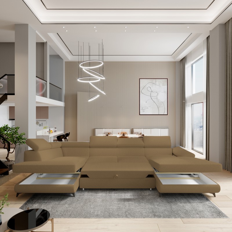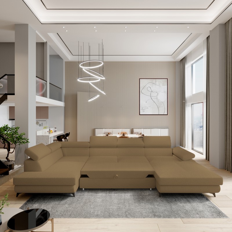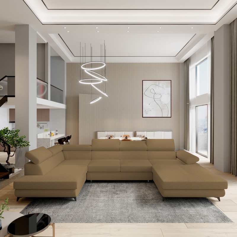 Funkcja spania wbudowana w narożnik pozwala szybko zmienić salon w komfortową przestrzeń noclegową - bez kompromisów, bez wysiłku. Dwa pojemniki na pościel to ukryty atut, który ułatwia życie: pozwalają uporządkować przestrzeń, jednocześnie pozostając całkowicie niewidoczne. Niezależnie od tego, czy urządzasz nowoczesny salon w apartamencie, czy szukasz stylowego mebla do przestronnej strefy dziennej, RUBANO daje Ci pełną elastyczność – dostępny jest w wersji prawo- i lewostronnej. Regulowane zagłówki i podłokietnik umożliwiają personalizację pozycji, zwiększając wygodę w każdej sytuacji – czy to relaks z książką, czy filmowy wieczór. RUBANO to narożnik, który staje się integralną częścią codzienności – subtelnie, ale zdecydowanie.