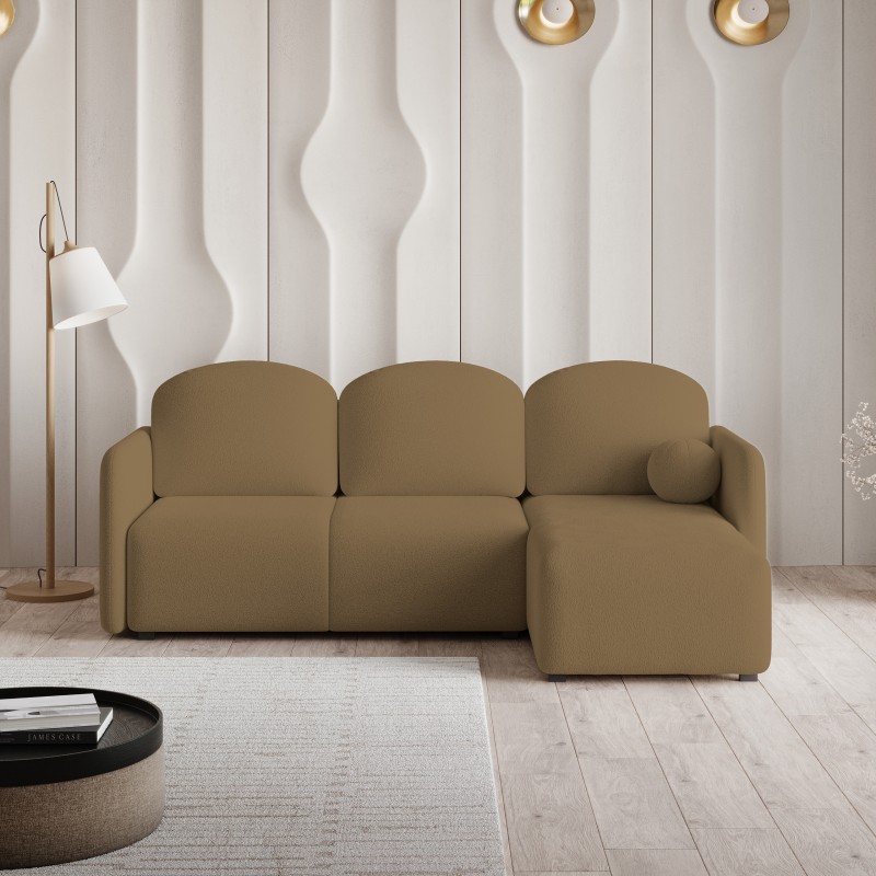 Obity tkaniną typu boucle – pętelkową, przyjemną w dotyku i strukturalnie wyrazistą – SUVINO nie tylko zaprasza do odpoczynku, ale staje się centralnym punktem aranżacji. Funkcja spania okazjonalnego sprawia, że SUVINO sprawdzi się nie tylko na co dzień, ale również podczas wizyty gości – wystarczy chwila, by zamienić go w wygodne miejsce do snu. Pod siedziskiem znajduje się praktyczny pojemnik na pościel, który pozwala zaoszczędzić cenną przestrzeń w mieszkaniu i utrzymać porządek. Wnętrze siedziska wypełnione zostało sprężynami falistymi, które zapewniają elastyczność, trwałość i optymalne podparcie – zarówno podczas siedzenia, jak i leżenia. SUVINO oferuje również pełnię komfortu dzięki trzem dużym, miękkim poduszkom oparciowym, które doskonale dopasowują się do sylwetki.