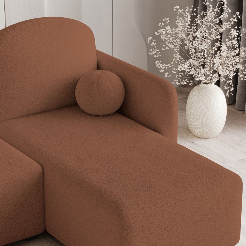 - Okrągła, miękka poduszka w kształcie kulki stanowi designerski akcent i uzupełnia nowoczesny wygląd narożnika. To nie tylko ozdoba, ale też dodatkowy element komfortu, który wyróżnia SUVINO na tle innych mebli.