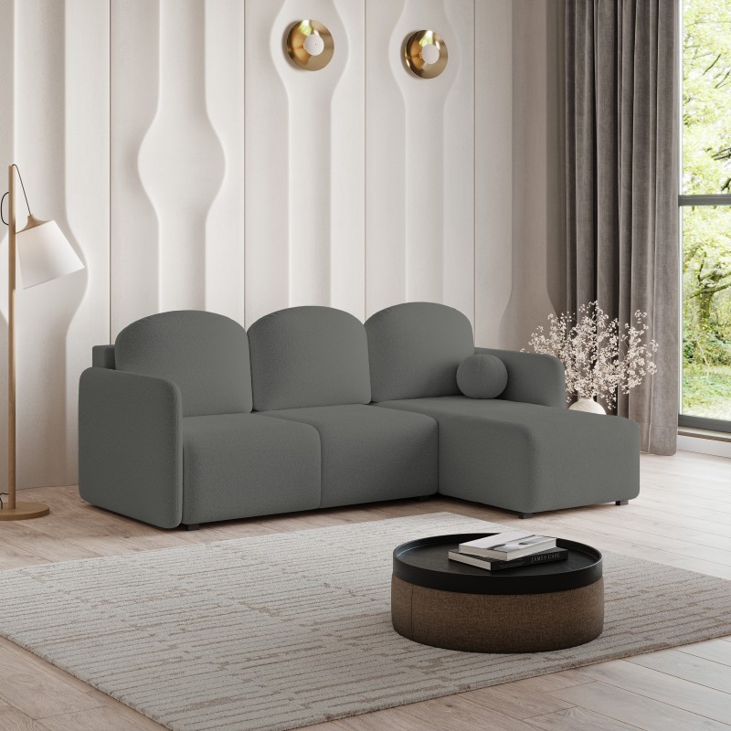 Obity tkaniną typu boucle – pętelkową, przyjemną w dotyku i strukturalnie wyrazistą – SUVINO nie tylko zaprasza do odpoczynku, ale staje się centralnym punktem aranżacji. Funkcja spania okazjonalnego sprawia, że SUVINO sprawdzi się nie tylko na co dzień, ale również podczas wizyty gości – wystarczy chwila, by zamienić go w wygodne miejsce do snu. Pod siedziskiem znajduje się praktyczny pojemnik na pościel, który pozwala zaoszczędzić cenną przestrzeń w mieszkaniu i utrzymać porządek. Wnętrze siedziska wypełnione zostało sprężynami falistymi, które zapewniają elastyczność, trwałość i optymalne podparcie – zarówno podczas siedzenia, jak i leżenia. SUVINO oferuje również pełnię komfortu dzięki trzem dużym, miękkim poduszkom oparciowym, które doskonale dopasowują się do sylwetki.