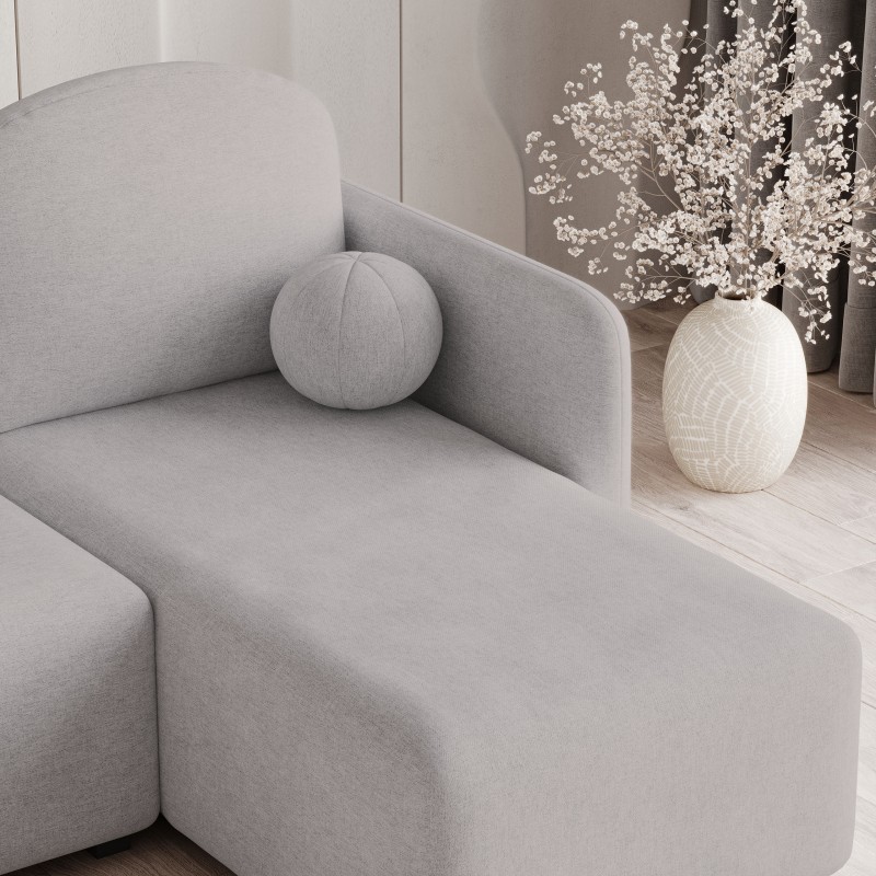 - Okrągła, miękka poduszka w kształcie kulki stanowi designerski akcent i uzupełnia nowoczesny wygląd narożnika. To nie tylko ozdoba, ale też dodatkowy element komfortu, który wyróżnia SUVINO na tle innych mebli.