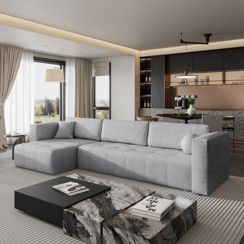 Model OLVERA oferuje nie tylko przestrzeń do siedzenia, ale również komfortowe miejsce do snu dzięki praktycznej funkcji spania. Wystarczy jeden ruch, by zamienić go w wygodne łóżko – idealne na okazjonalne noclegi. Zastosowanie sprężyn falistych gwarantuje stabilność oraz wyjątkowy komfort użytkowania. To konstrukcja zaprojektowana na lata – odporna na codzienne użytkowanie i zachowująca swój kształt. Wyjątkową cechą narożnika OLVERA jest jego uniwersalność – możesz samodzielnie zdecydować o stronie montażu, dopasowując układ do swojego wnętrza. Niezależnie od tego, czy urządzasz przestronny salon, czy kompaktowy pokój dzienny, OLVERA świetnie się odnajdzie. Obity nowoczesną tkaniną Neve, narożnik zachwyca swoją subtelną strukturą i miękkością. Neve to materiał o lekko melanżowym wykończeniu, który pięknie pracuje ze światłem i podkreśla bryłę mebla – przyjemny w dotyku, odporny i wyjątkowo estetyczny.