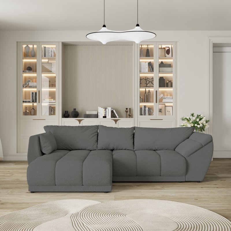 Narożnik osadzony jest na niskich, solidnych nóżkach, które podkreślają jego masywną bryłę i zapewniają stabilność. Dzięki nim ORENTI prezentuje się nowocześnie, ale nie dominuje optycznie we wnętrzu.