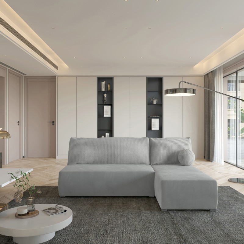 PARVELO to nie tylko styl, ale i funkcjonalność. Dzięki funkcji spania szybko zamienisz go w wygodne łóżko, a wbudowany pojemnik na pościel pomieści wszystkie niezbędne tekstylia. Co ważne – narożnik ma uniwersalną konstrukcję, co oznacza, że stronę (lewą lub prawą) wybierzesz dopiero przy montażu. Maksymalna elastyczność dla Twojego wnętrza. Wersja PARVELO opiera się na eleganckim połączeniu dwóch tkanin: aksamitnie gładkiej tkaniny KRONOS oraz sztruksowej, strukturalnej tkaniny POSO. Ten duet nie tylko przyciąga wzrok, ale także wyróżnia się trwałością i komfortem użytkowania. Gładka tkanina na siedzisku świetnie kontrastuje z wyrazistym sztruksem na poduszkach – tworząc modny, ale ponadczasowy efekt.