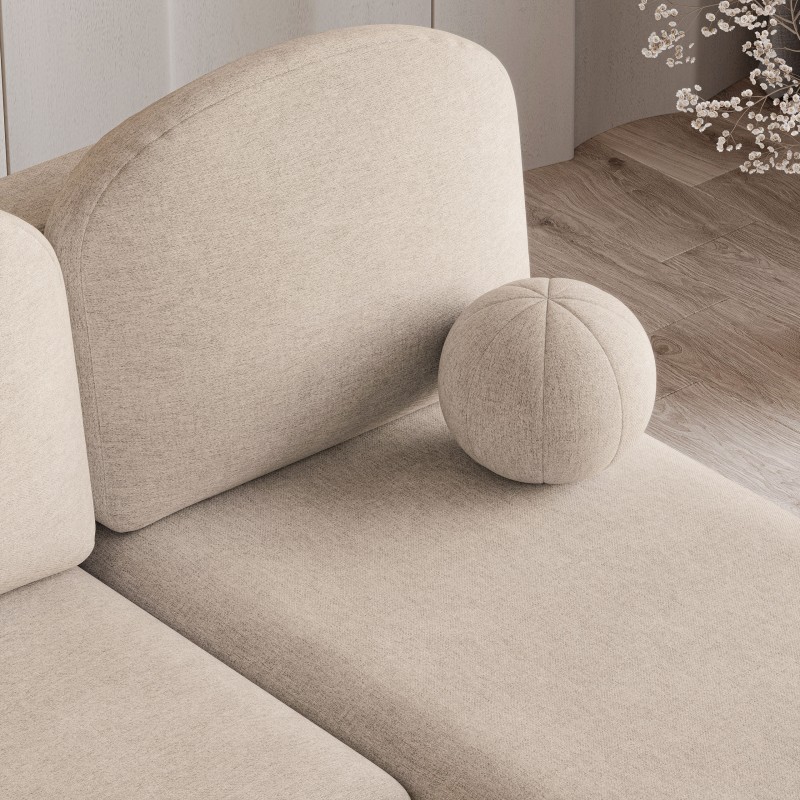 Kompaktowe wymiary sprawiają, że Trama to idealny wybór do mieszkań i domów, w których liczy się każdy metr kwadratowy. Niewielka szerokość pozwala zmieścić go w mniejszych salonach, a jednocześnie zachować pełną wygodę siedzenia czy leżenia. Wbudowana funkcja spania świetnie sprawdzi się, kiedy musisz przenocować niezapowiedzianych gości. Nie można pominąć wyjątkowej tkaniny Neve, która odgrywa tu kluczową rolę. Jej subtelna, lekko melanżowa faktura nadaje narożnikowi naturalnego, eleganckiego wyglądu. Jest przyjemna w dotyku, a jednocześnie odporna na codzienne użytkowanie – cechuje się wysoką trwałością i łatwością czyszczenia, co czyni ją idealnym wyborem dla rodzin, osób posiadających zwierzęta czy po prostu tych, którzy cenią sobie praktyczne rozwiązania. Dodatkowym elementem wyróżniającym model Trama jest dekoracyjna poduszka w kształcie kuli. To detal, który podkreśla nowoczesny, designerski charakter mebla.