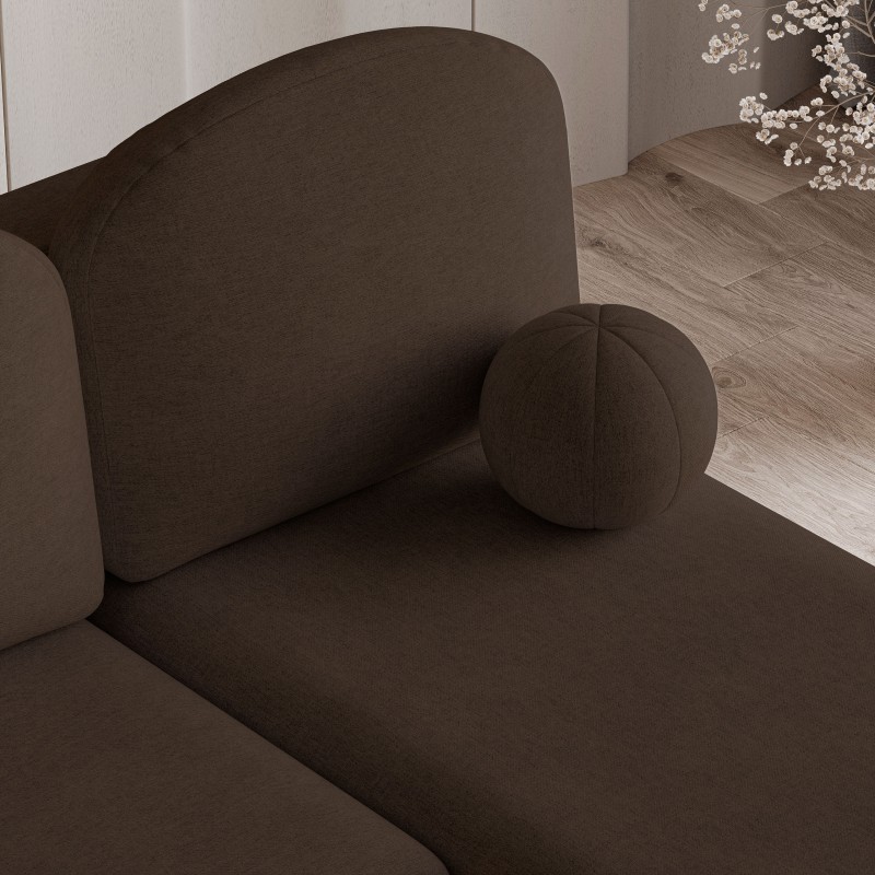 Kompaktowe wymiary sprawiają, że Trama to idealny wybór do mieszkań i domów, w których liczy się każdy metr kwadratowy. Niewielka szerokość pozwala zmieścić go w mniejszych salonach, a jednocześnie zachować pełną wygodę siedzenia czy leżenia. Wbudowana funkcja spania świetnie sprawdzi się, kiedy musisz przenocować niezapowiedzianych gości. Nie można pominąć wyjątkowej tkaniny Neve, która odgrywa tu kluczową rolę. Jej subtelna, lekko melanżowa faktura nadaje narożnikowi naturalnego, eleganckiego wyglądu. Jest przyjemna w dotyku, a jednocześnie odporna na codzienne użytkowanie – cechuje się wysoką trwałością i łatwością czyszczenia, co czyni ją idealnym wyborem dla rodzin, osób posiadających zwierzęta czy po prostu tych, którzy cenią sobie praktyczne rozwiązania. Dodatkowym elementem wyróżniającym model Trama jest dekoracyjna poduszka w kształcie kuli. To detal, który podkreśla nowoczesny, designerski charakter mebla.