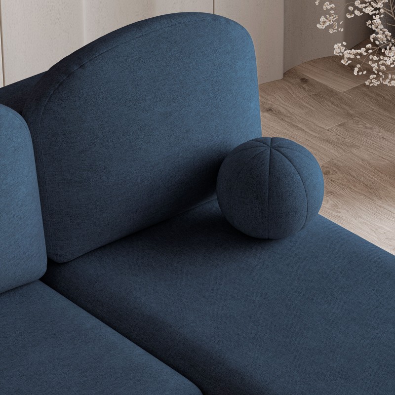 Kompaktowe wymiary sprawiają, że Trama to idealny wybór do mieszkań i domów, w których liczy się każdy metr kwadratowy. Niewielka szerokość pozwala zmieścić go w mniejszych salonach, a jednocześnie zachować pełną wygodę siedzenia czy leżenia. Wbudowana funkcja spania świetnie sprawdzi się, kiedy musisz przenocować niezapowiedzianych gości. Nie można pominąć wyjątkowej tkaniny Neve, która odgrywa tu kluczową rolę. Jej subtelna, lekko melanżowa faktura nadaje narożnikowi naturalnego, eleganckiego wyglądu. Jest przyjemna w dotyku, a jednocześnie odporna na codzienne użytkowanie – cechuje się wysoką trwałością i łatwością czyszczenia, co czyni ją idealnym wyborem dla rodzin, osób posiadających zwierzęta czy po prostu tych, którzy cenią sobie praktyczne rozwiązania. Dodatkowym elementem wyróżniającym model Trama jest dekoracyjna poduszka w kształcie kuli. To detal, który podkreśla nowoczesny, designerski charakter mebla.