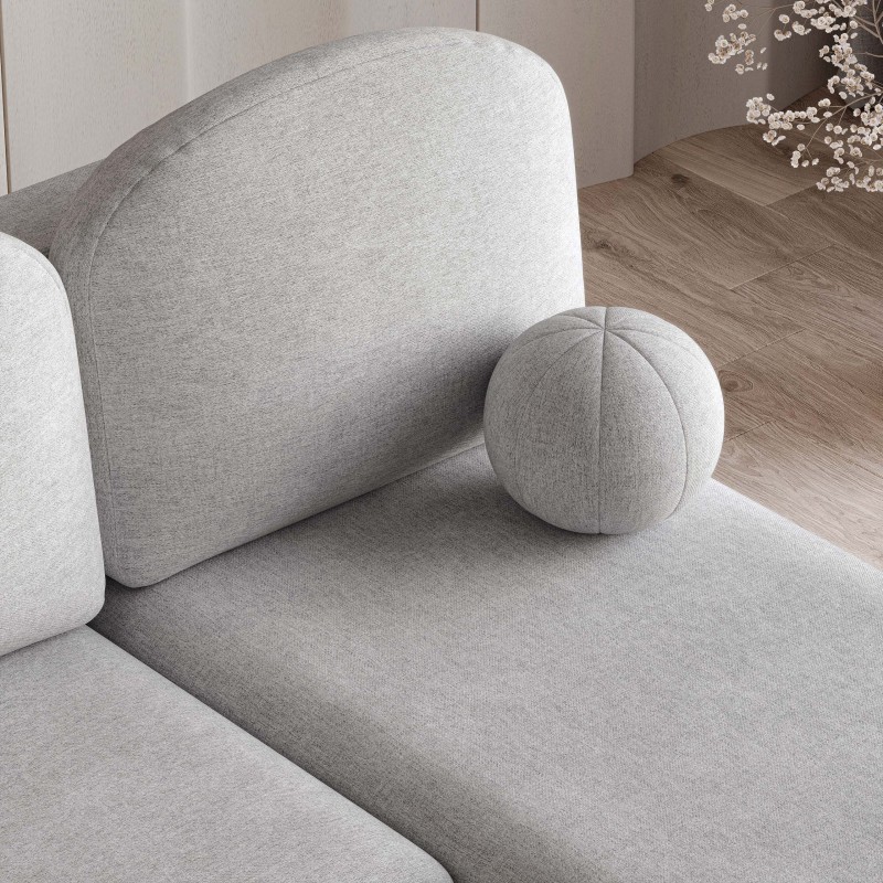 Kompaktowe wymiary sprawiają, że Trama to idealny wybór do mieszkań i domów, w których liczy się każdy metr kwadratowy. Niewielka szerokość pozwala zmieścić go w mniejszych salonach, a jednocześnie zachować pełną wygodę siedzenia czy leżenia. Wbudowana funkcja spania świetnie sprawdzi się, kiedy musisz przenocować niezapowiedzianych gości. Nie można pominąć wyjątkowej tkaniny Neve, która odgrywa tu kluczową rolę. Jej subtelna, lekko melanżowa faktura nadaje narożnikowi naturalnego, eleganckiego wyglądu. Jest przyjemna w dotyku, a jednocześnie odporna na codzienne użytkowanie – cechuje się wysoką trwałością i łatwością czyszczenia, co czyni ją idealnym wyborem dla rodzin, osób posiadających zwierzęta czy po prostu tych, którzy cenią sobie praktyczne rozwiązania. Dodatkowym elementem wyróżniającym model Trama jest dekoracyjna poduszka w kształcie kuli. To detal, który podkreśla nowoczesny, designerski charakter mebla.