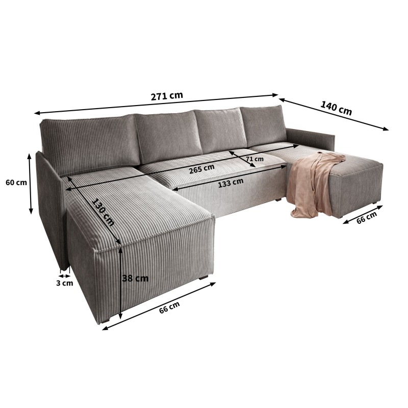 - Duży narożnik z funkcją spania oferuje miejsce do snu dla kilku osób, a wbudowany pojemnik zapewnia łatwy dostęp do pościeli dla gości, zawsze będącej pod ręką.
