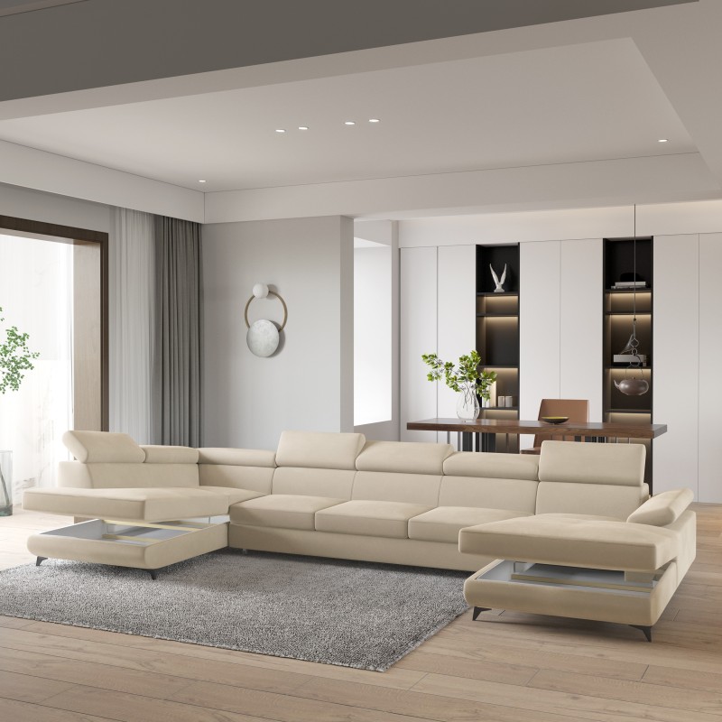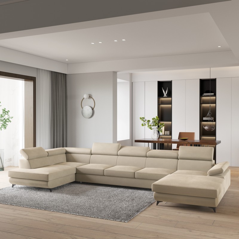 Jeśli szukasz narożnika, który pomieści całą rodzinę, zachwyci funkcjonalnością i wprowadzi do wnętrza nutę luksusu – Montiva jest stworzony właśnie dla Ciebie. To monumentalna konstrukcja, która nie tylko robi wrażenie rozmiarem, ale też perfekcyjnie łączy nowoczesną elegancję z codzienną wygodą.