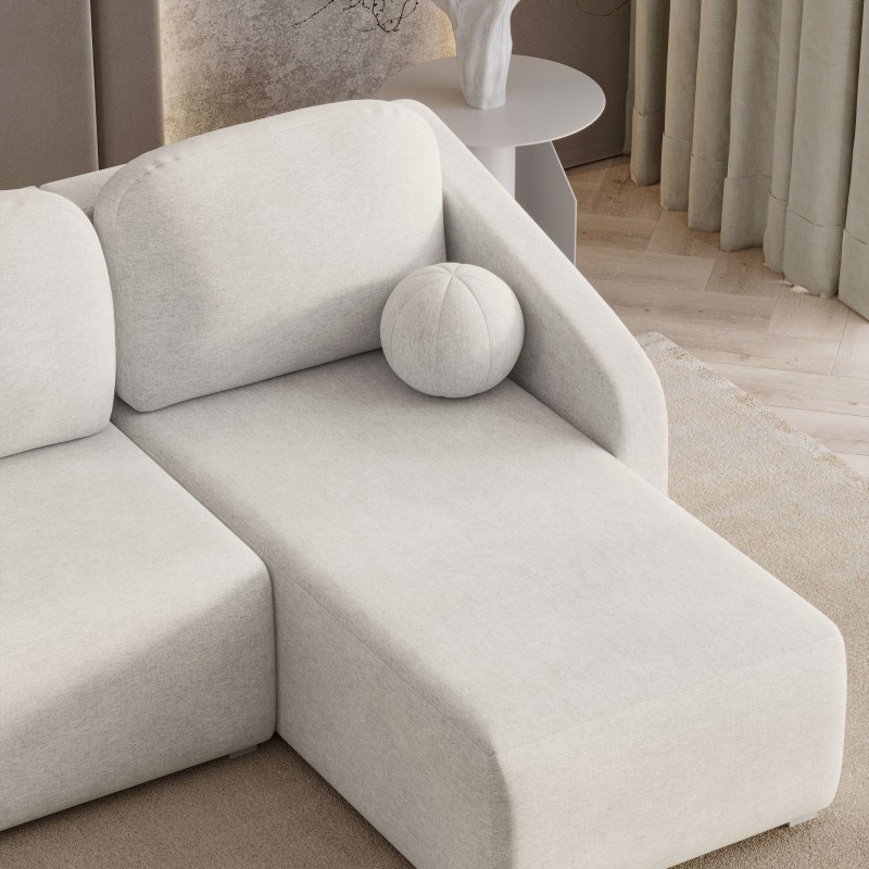 Dwie obszerne poduszki oparciowe oraz dekoracyjna poduszka w kształcie kulki sprawiają, że MARELLO to narożnik nie tylko praktyczny, ale i pełen stylu. Ozdobny detal przyciąga wzrok, nadając meblowi designerskiego sznytu, a jednocześnie podkreśla jego przyjazny i nowoczesny charakter. W tkaninie Neve MARELLO prezentuje się wyjątkowo elegancko. Neve to materiał o delikatnej, welwetowej strukturze, przyjemnej w dotyku i subtelnie matowej. Jej miękkość i szlachetny wygląd doskonale łączą się z funkcjonalnością – tkanina jest wytrzymała i odporna na codzienne użytkowanie. To sprawia, że narożnik świetnie odnajdzie się w różnych aranżacjach – od nowoczesnego minimalizmu, przez japandi, aż po klasyczne wnętrza z nutą elegancji.