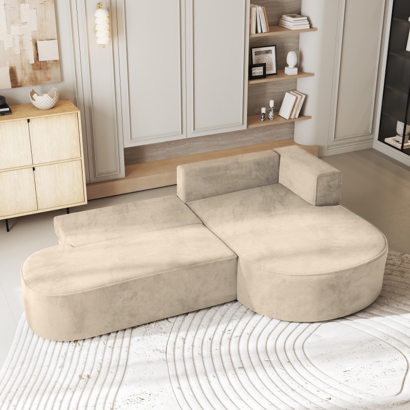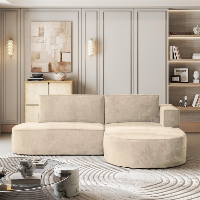 - Zaokrąglona otomana – miękki akcent i unikalny design. Obły kształt otomany przełamuje klasyczną geometrię narożników, nadając całości eleganckiego i nowoczesnego wyrazu. To także idealne miejsce do relaksu w pozycji półleżącej.