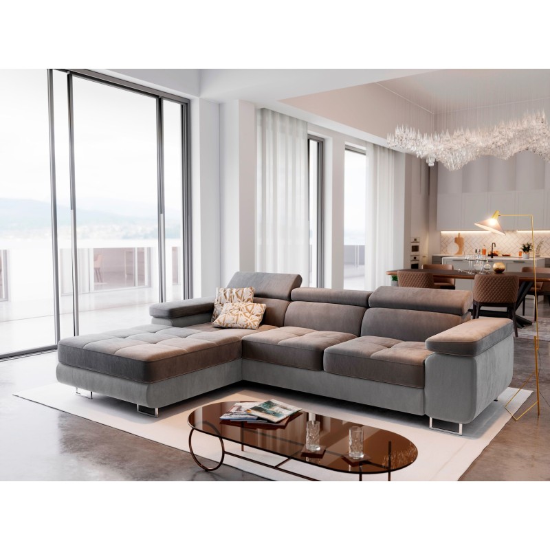 ELMA to masywny narożnik w kształcie litery L, tworzący elegancką strefę wypoczynkową. Gładkie, minimalistyczne wykończenie ułatwia dopasowanie do różnych aranżacji, a regulowane zagłówki i siedziska ze sprężyną falistą dbają o wygodę podczas długich wieczorów relaksu. Dwa pojemniki oraz funkcja spania sprawiają, że to mebel nie tylko stylowy, ale i niezwykle praktyczny. Wybierając wersję lewą lub prawą, łatwo dopasujesz go do układu pomieszczenia.