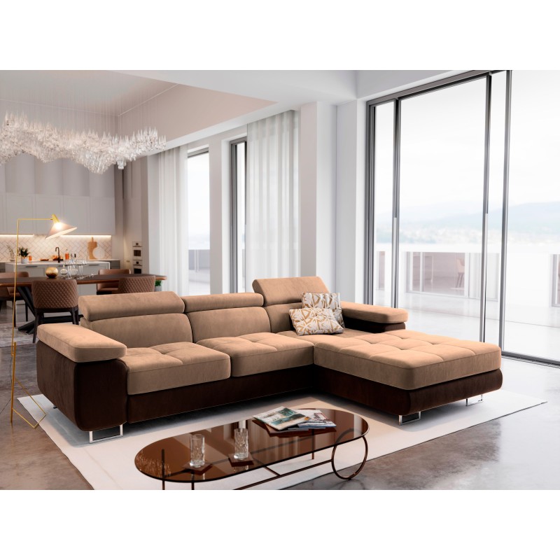 ELMA to masywny narożnik w kształcie litery L, tworzący elegancką strefę wypoczynkową. Gładkie, minimalistyczne wykończenie ułatwia dopasowanie do różnych aranżacji, a regulowane zagłówki i siedziska ze sprężyną falistą dbają o wygodę podczas długich wieczorów relaksu. Dwa pojemniki oraz funkcja spania sprawiają, że to mebel nie tylko stylowy, ale i niezwykle praktyczny. Wybierając wersję lewą lub prawą, łatwo dopasujesz go do układu pomieszczenia.
