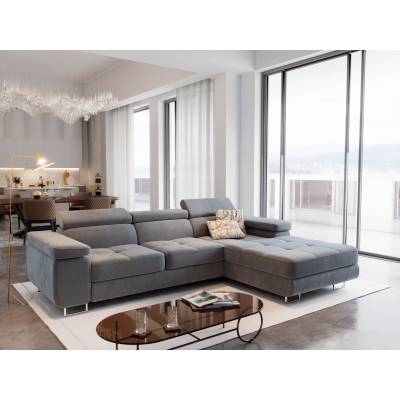 ELMA to masywny narożnik w kształcie litery L, tworzący elegancką strefę wypoczynkową. Gładkie, minimalistyczne wykończenie ułatwia dopasowanie do różnych aranżacji, a regulowane zagłówki i siedziska ze sprężyną falistą dbają o wygodę podczas długich wieczorów relaksu. Dwa pojemniki oraz funkcja spania sprawiają, że to mebel nie tylko stylowy, ale i niezwykle praktyczny. Wybierając wersję lewą lub prawą, łatwo dopasujesz go do układu pomieszczenia.