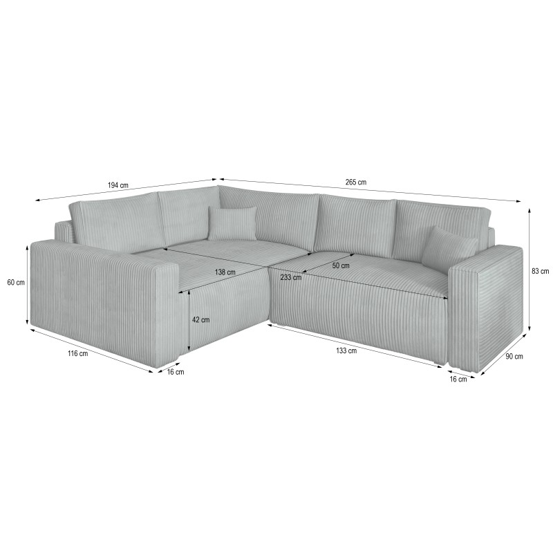 Dzięki możliwości wyboru strony (lewostronny lub prawostronny) oraz kompaktowej, lecz pojemnej formie, ERONIS z łatwością dopasujesz do układu wnętrza. Funkcja spania umożliwia rozłożenie narożnika w kilka chwil – idealnie podczas wizyt rodziny czy nocowania gości.