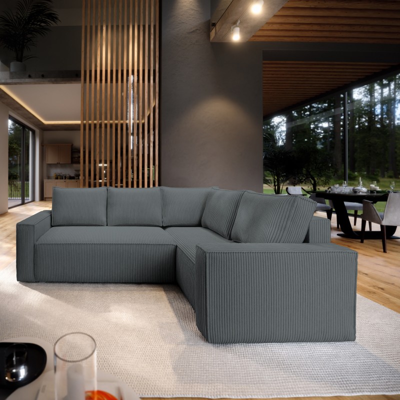 Model zaprojektowano w praktycznym kształcie litery L, by maksymalnie wykorzystać przestrzeń – zarówno w mniejszych, jak i większych pomieszczeniach. Dostępność wersji lewo- i prawostronnej pozwala dopasować układ do Twojego salonu.